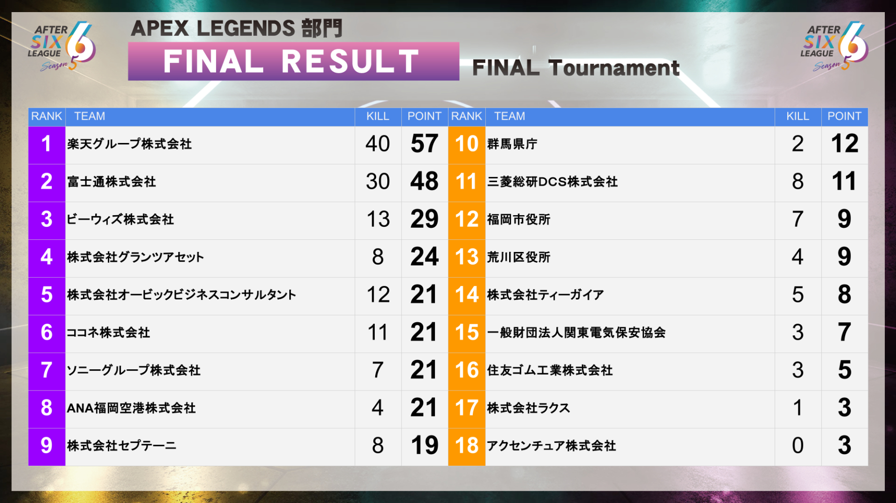 | 順位 | チーム名 | キル数 | ポイント |