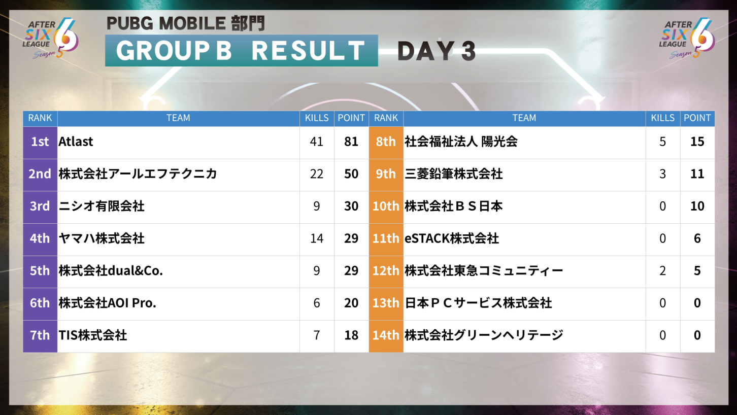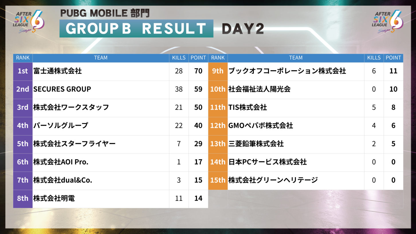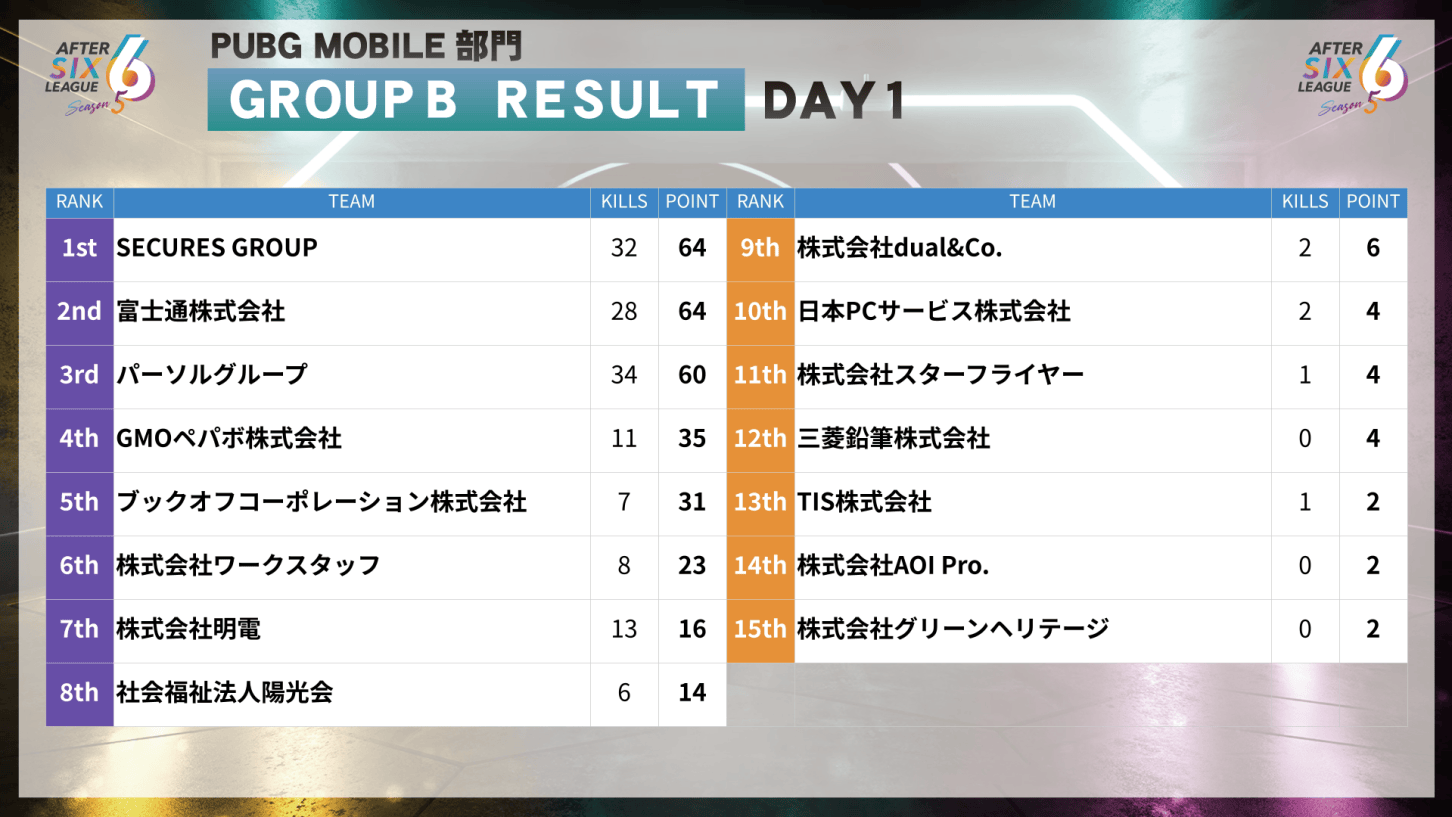 | 順位 | チーム名 | キル数 | リーグポイント |
