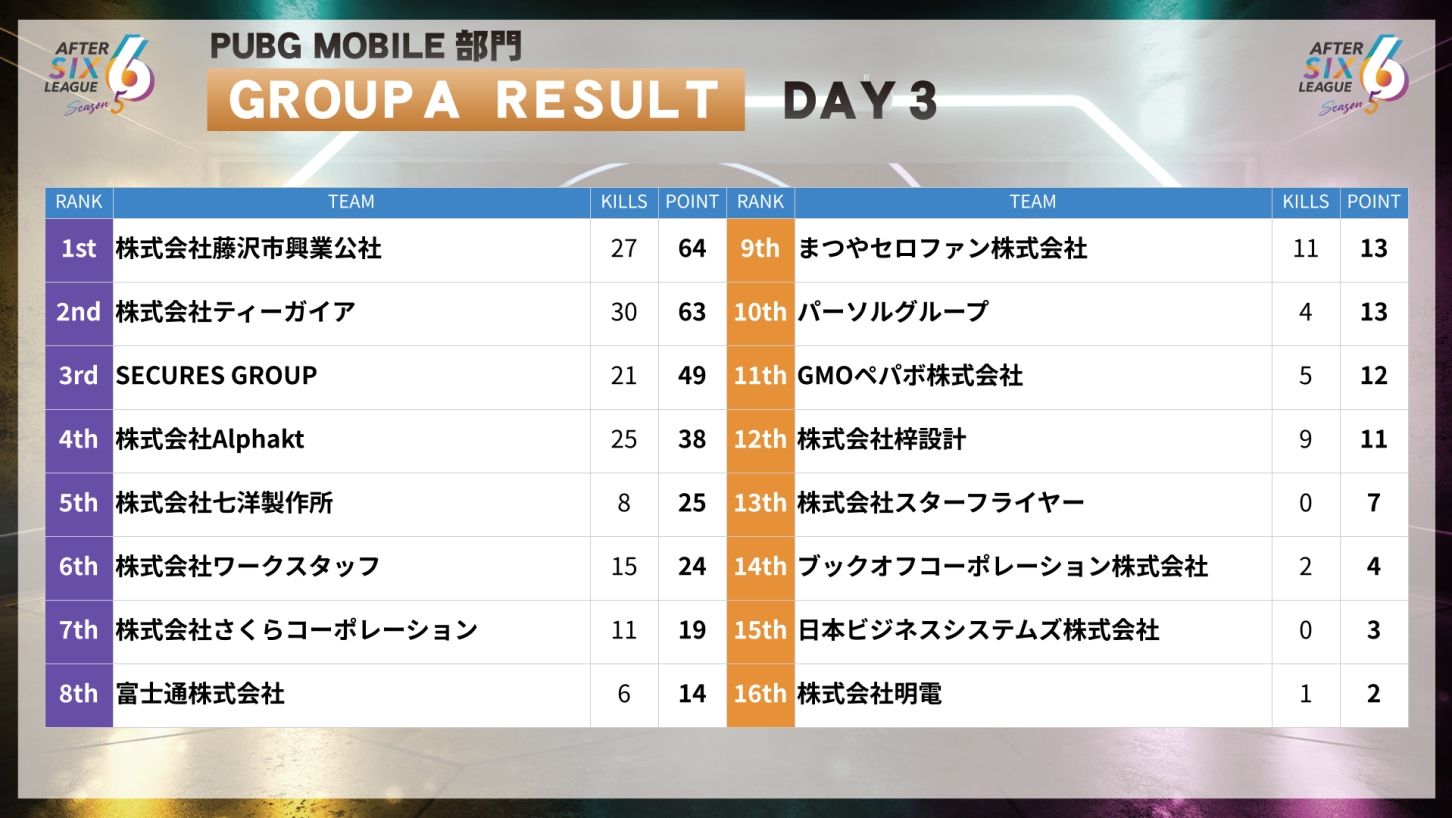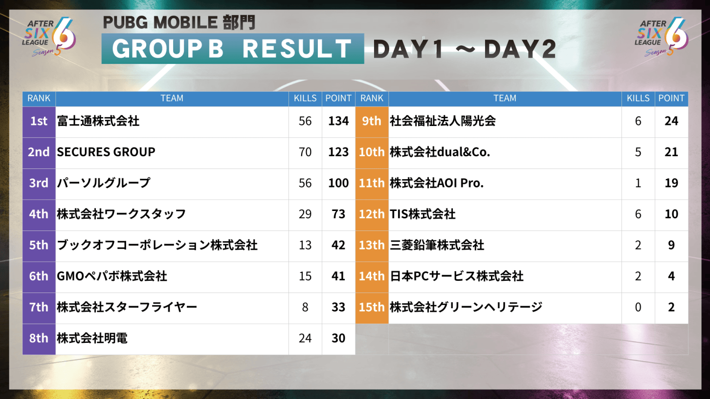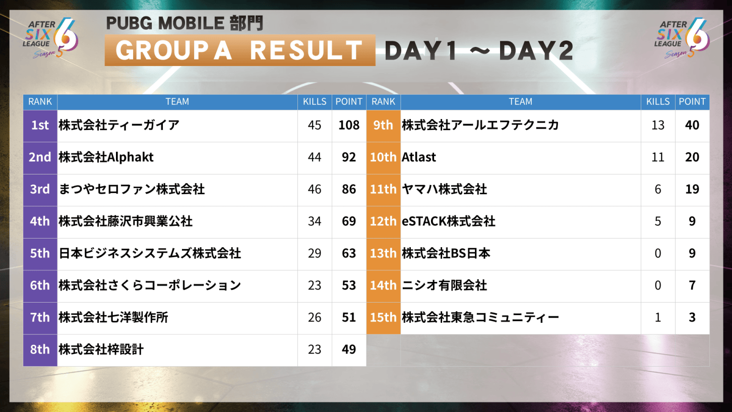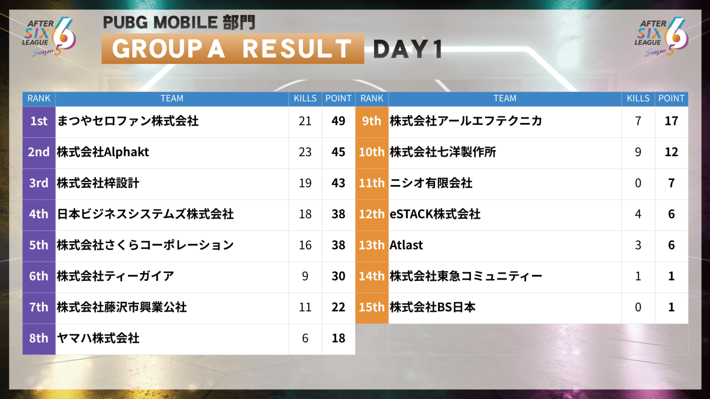 | 順位 | チーム名 | キル数 | リーグポイント |